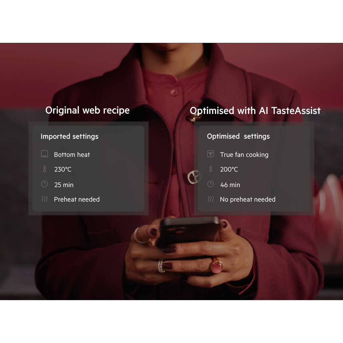 Remove any guesswork and enjoy your oven’s full capabilities with AI TasteAssist. Simply send a web recipe to your oven via our app and let AI optimise the time, temperature and functions, bringing out the best in every dish.