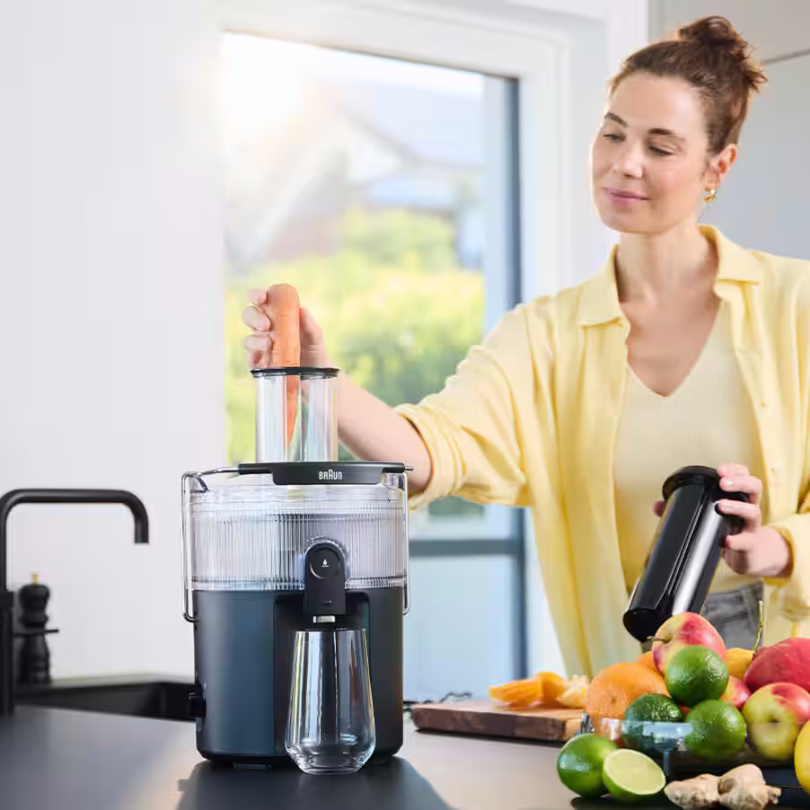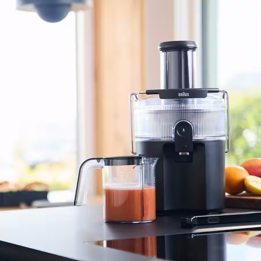 With this spin juicer by your side, you can blend the goodness of fresh fruits and vegetables into every glass, fast and easy. The combination of Braun’s FastXtract – and ColdXtract Technology ensures that each full glass* of juice is rich in vitamins and ready in just 15 seconds. The 75mm filling chute minimizes preparation time by effortlessly handling large pieces of fruit and vegetables, and even whole apples. What’s more, the large pulp container allows for uninterrupted juicing without stopping to empty the pulp, letting you extract up to 2L of healthy juice hassle-free.