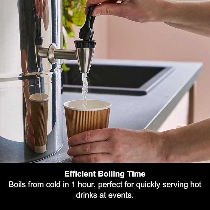 - Efficient Boiling Time:Â Boils from cold in 1 hour. It allows you to quickly prepare a large quantity of hot drinks for events or large gatherings.