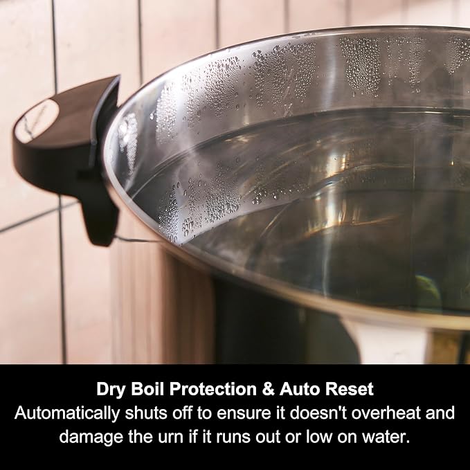 - Dry Boil Protection & Auto Reset:Â It automatically shuts off to ensure it doesn’t overheat and damage the urn if it runs out or low on water.