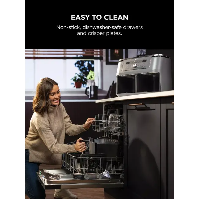 Dual Zone cooking just got a brand new look. Meet the large capacity air fryer that cooks 2 foods, 2 ways, and finishes at the same time – now with an updated design and sleek, dark grey metallic trim.