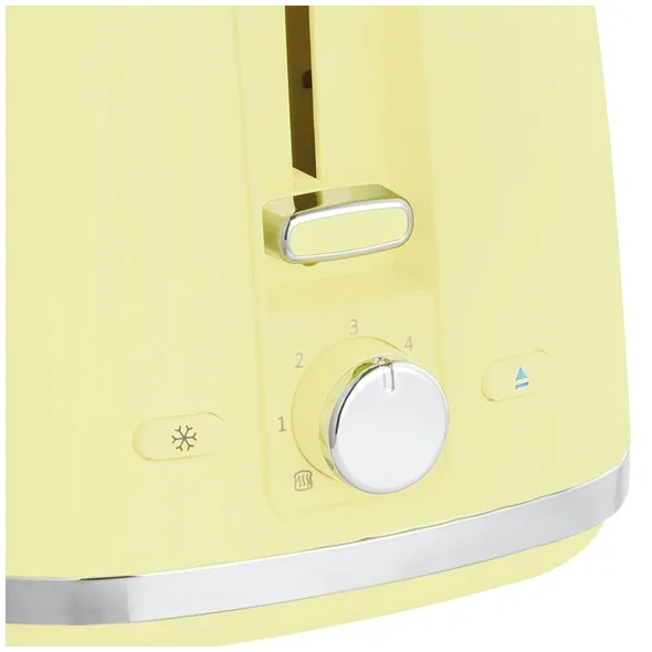 With chrome accents and elegant textured grooves in on-trend lemon, this toaster is a statement piece for a stylish kitchen.